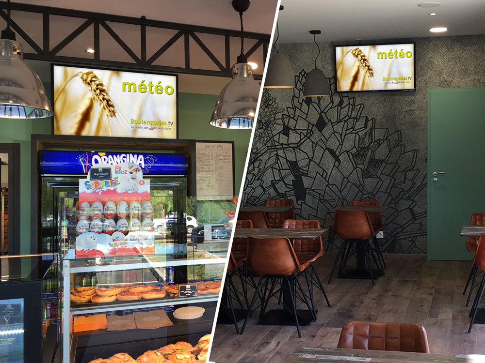 La Mie du Pain a souhaité rejoindre le réseau Boulangeries TV en s’équipant de 2 écrans positionnés dans l’axe de la ligne de caisse pour le premier, et le second pour animer la vaste et belle salle de snacking.